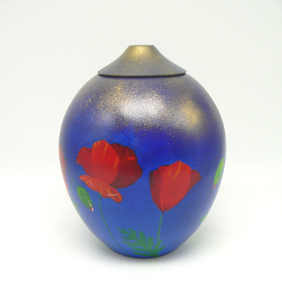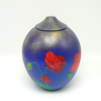 A hársfát gondosan megmunkálva készült az urna. A díszítést az alakjához igazítottuk. Előre megtervezve több rétegben vittük fel a festéket, a háttér megszáradása után, majd felkerültek a nyíló virágok.